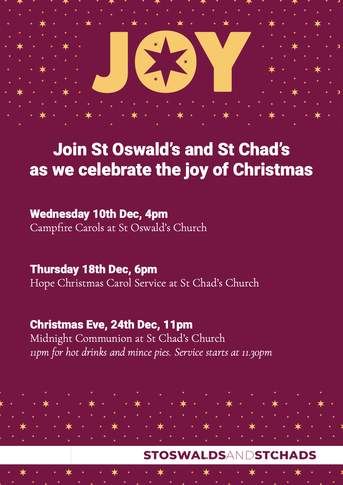 We'd love for you to join us over Christmas. There are church services for everyone and special activities for families . On Christmas Eve we have our Christingle service for families at 3pm, a midnight service with communion at 11.30pm, and then on Christmas day itself a 10:30am short celebration of the birth of Jesus.